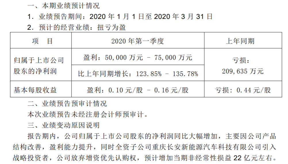同日,长安汽车一同发布2020年第一季度业绩预告,预计一季度归母净利润为5-7.5亿元,实现扭亏为盈,相比去年同期20.96亿元的亏损,增长了123.85%-135.78%。