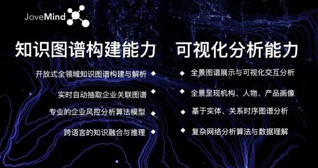 格物致知、明者远见。为了给企业提供真正有价值的线索,JoveMind知识图谱构建分析平台利用全球海量不断持续增长的数据,构建起大规模的知识图谱,展示了强大的可视化分析能力和企业风险控制能力。JoveMind透过复杂网络分析算法与数据理解,为企业提供包括竞争、业务地域、业务关联等企业决策支撑和声誉、战略、信用等方面的风险提示,还可以与生物制药、金融科技、公共安全等领域数据对接,定制出辅助诊断、技术前瞻、社会态势等不同的分析与展示维度。