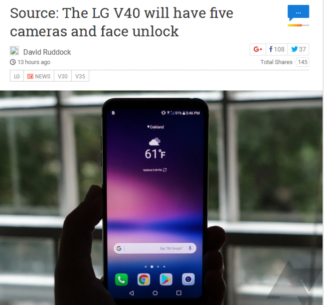 报道称LG V40会搭载骁龙845处理器保障手机性能运行,强悍性能的芯片保证手机快速运行应该是没什么难度的,就是不知道手机续航怎么样,毕竟有五个摄像镜头耗能,4000mAh的电池续航能不能让用户满意还是未知数,支不支持快充技术也是关键点。