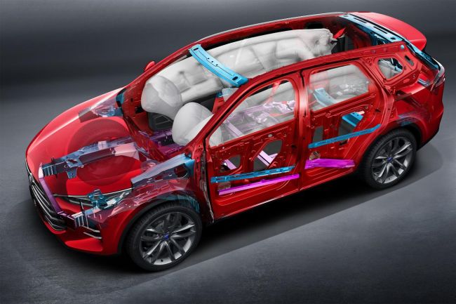 被动安全——全新一代唐遵循“关键零部件到系统匹配到整车碰撞”的被动安全设计思路,采用LCB高刚性轻量化安全车身平台,整车高强度钢板应用比例高达63%,并借助拓扑优化技术,实现车身强度和轻量化的双重优化。从车身高强度钢分布图来看,其侧围用超高强度热成型A/B柱与超高强度辊压件门槛组成门环结构,而且在门内外板间均布置有高强度的防侧撞安全保护杆,防碰撞性能极高。