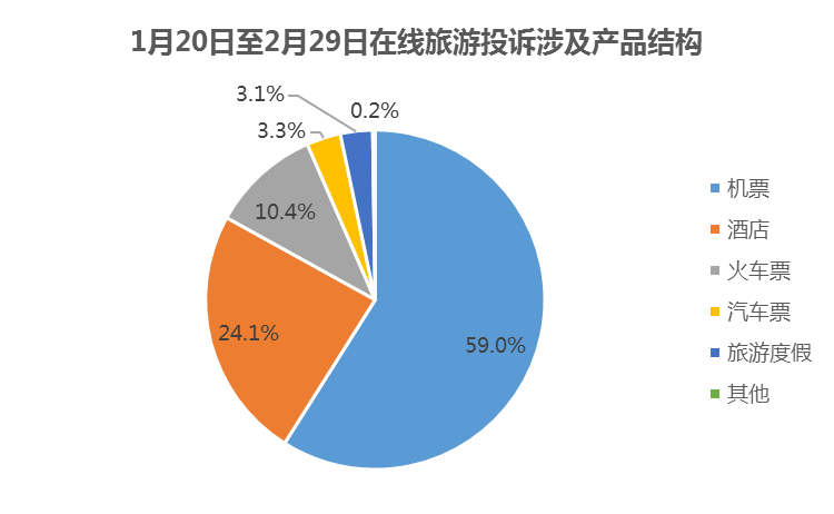 报告显示,消费者投诉涉及产品结构方面,1月21日至2月29日,来自国内主要在线旅游平台的机票退票相关投诉大约占比59%,与酒店退订相关的投诉大约占比24.1%左右,火车票相关的投诉大约占比10.4%,汽车票方面的投诉大约占比3.3%,旅游度假投诉大约占比3.1%。