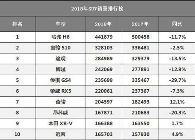 就销量榜前十的SUV而言,除奇骏、XR-V、逍客微增以外,其余车型的销量均出现了不同程度的下滑。其中下滑最明显的为广汽传祺GS4,2018年销量仅为23.5万辆,同比下滑29.7%,传祺GS4这个千年老二,在2018年已经跌倒了第五名。长期霸占冠军宝座的哈弗H6在2018年的销量也出现了明显的下降,销量只有44万辆,同比下滑11.7%。受整体车市影响,SUV市场也受到了较大冲击。